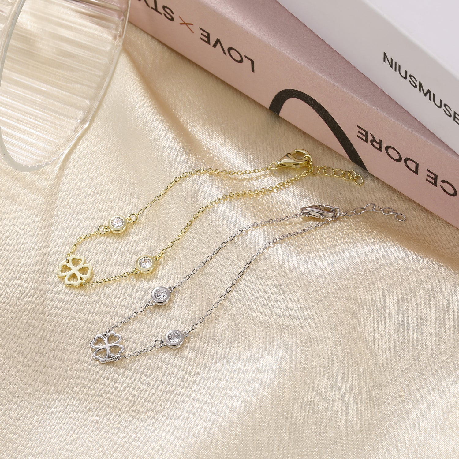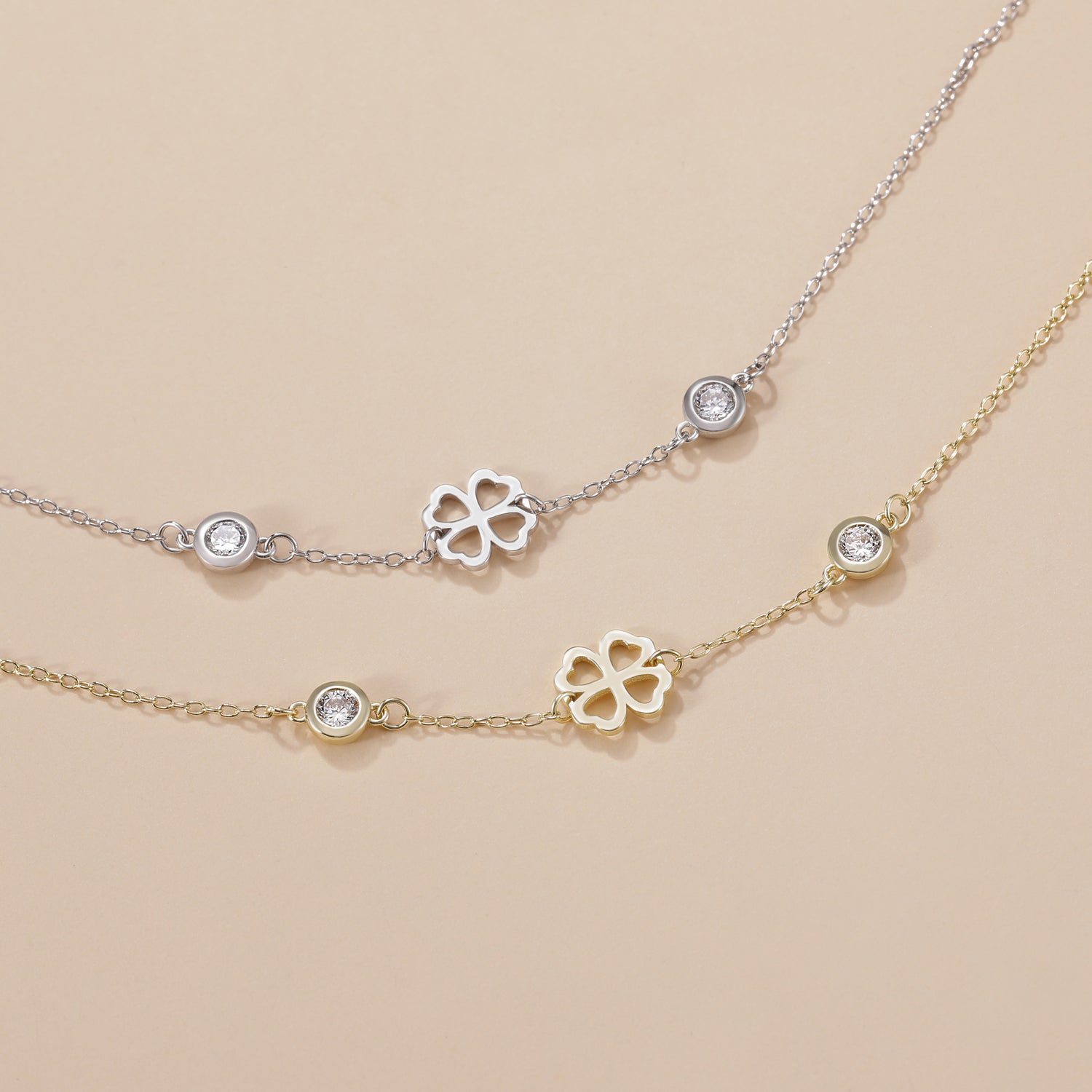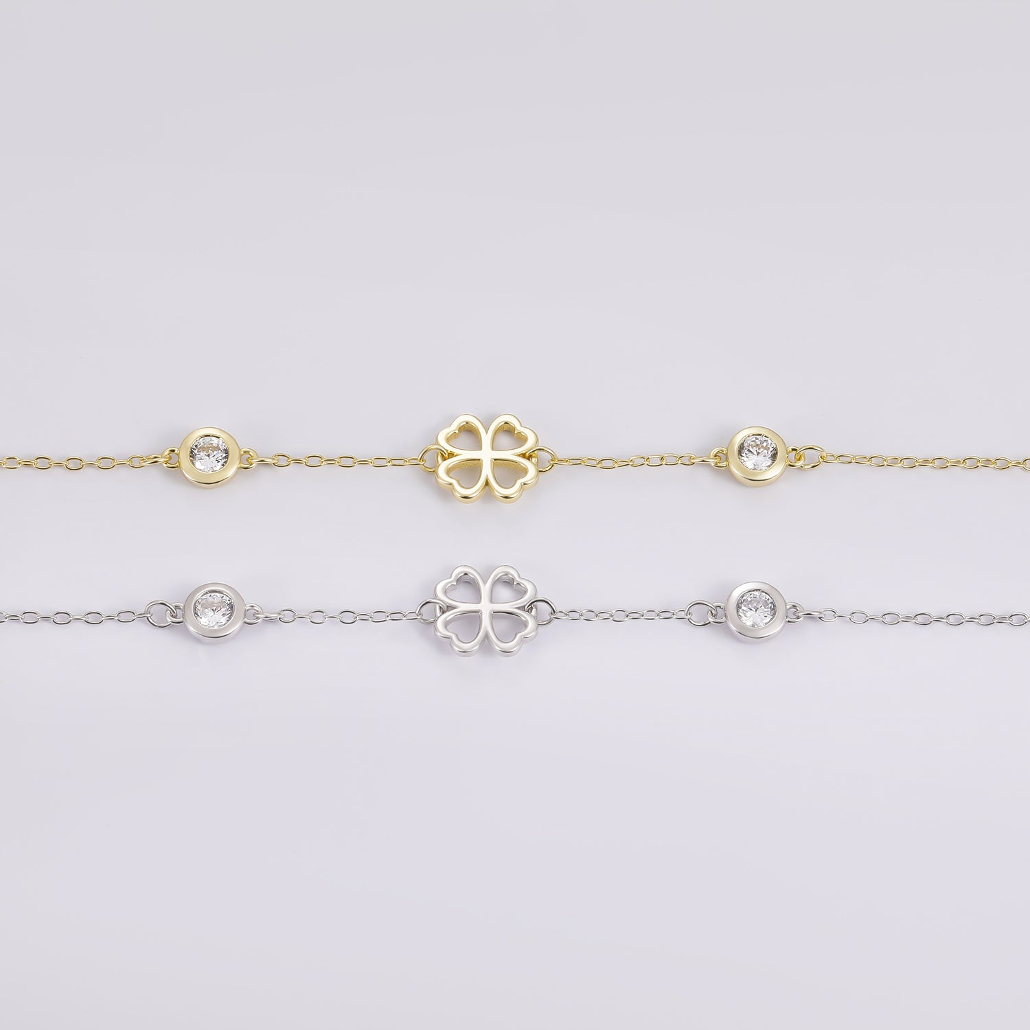 Features: 4mm CZ stone, 9.1mm clover charm, chain length 17cm with 2cm extension