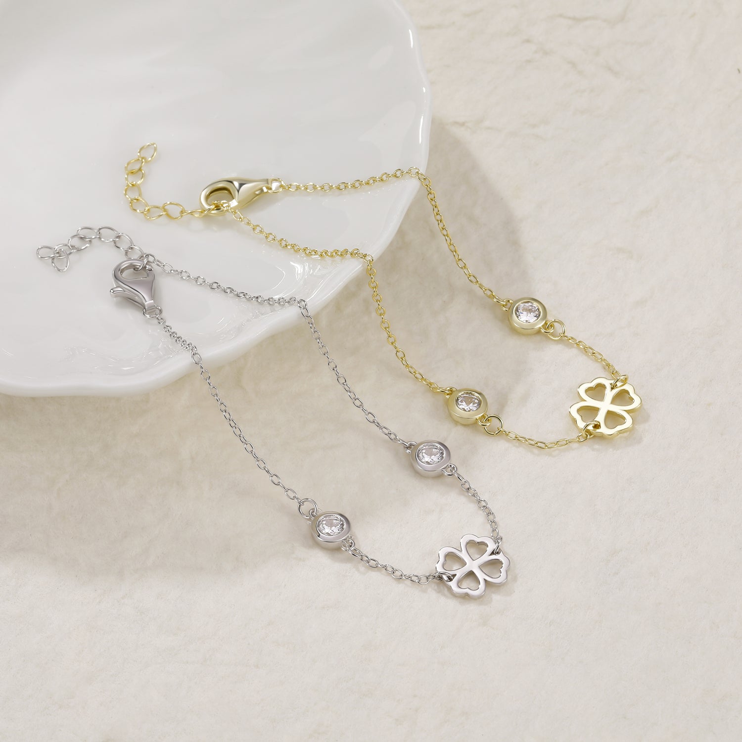 Create your own luck with this charming bracelet, featuring a cutout four-leaf clover and two birthstones. The clover symbolizes good fortune, while the birthstones can represent loved ones or meaningful milestones. Whether you're wearing it every day or for a special occasion, this bracelet adds a pop of bright detail to any look!