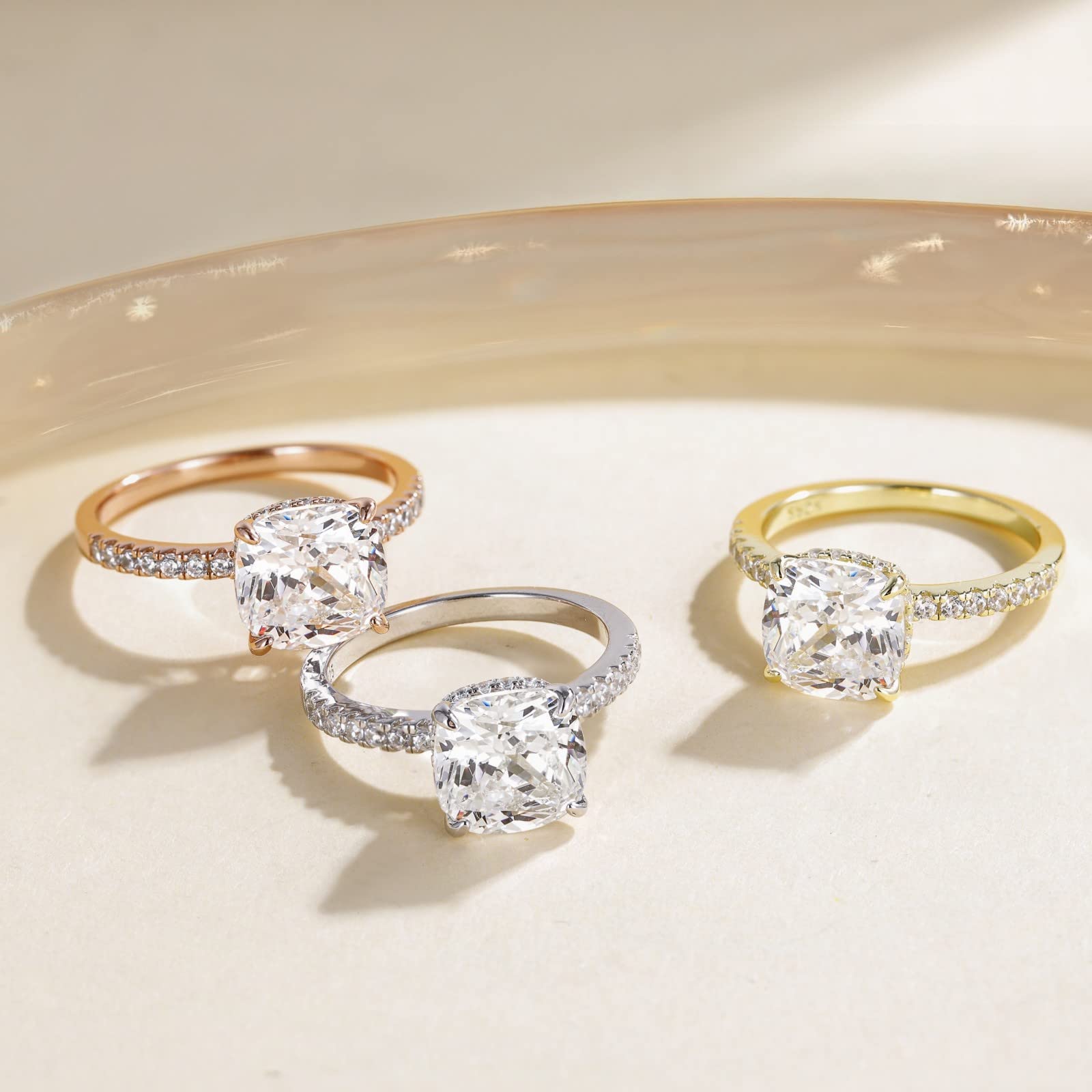 Questo elegante anello di fidanzamento presenta due scintillanti aloni nascosti che avvolgono la gemma centrale. Una piccola fascia scintillante completa la galleria per un look elegante e chic. Disponibile nelle taglie dalla 5 alla 10, è perfetto per una promessa sincera, un impegno, un matrimonio o un anello di coppia.