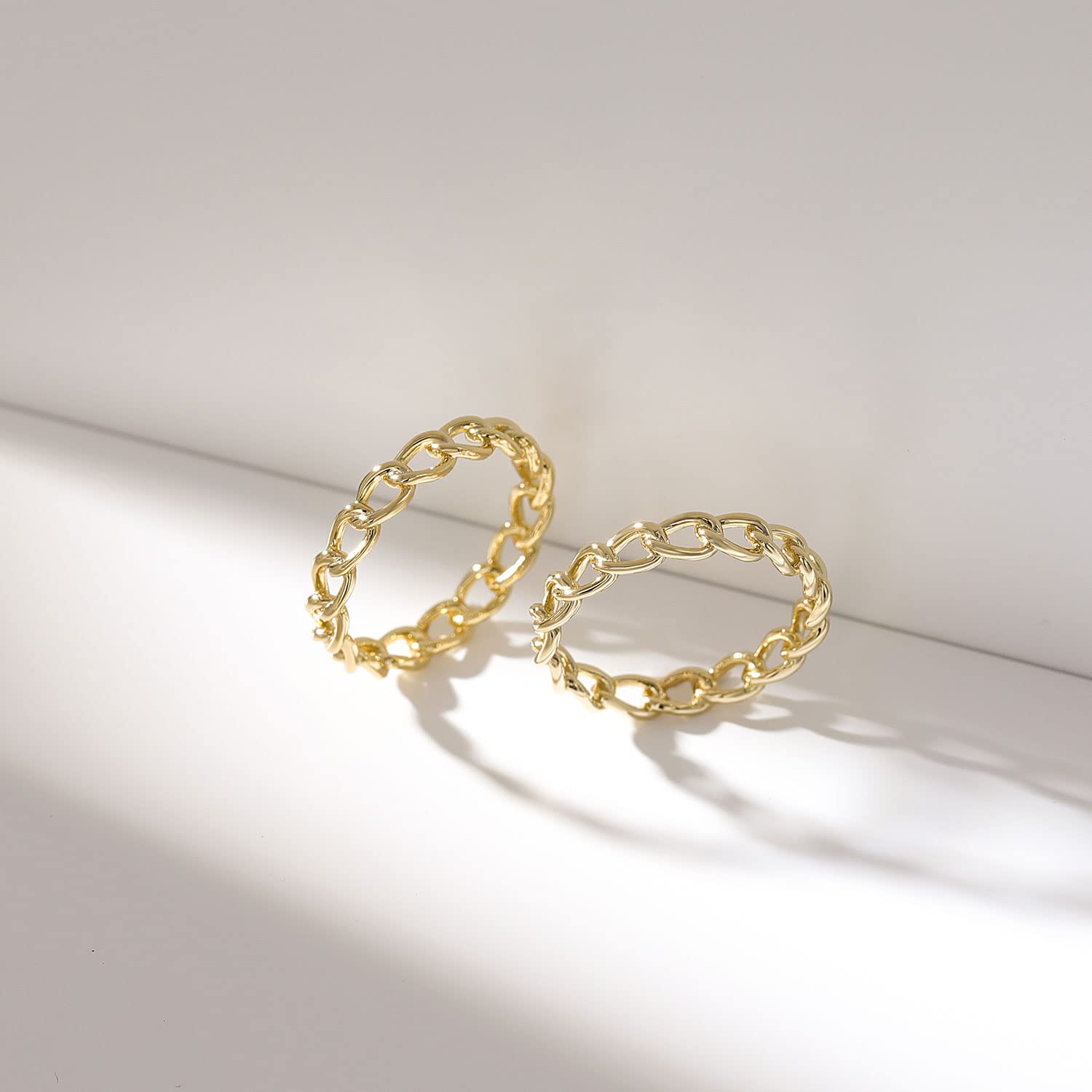 Un anello semplice e delicato rifinito con una forma a catena che può essere utilizzato come anello impilabile, anello per le nocche, anello per il pollice, anello per il mignolo e altro ancora. Elegante e confortevole, questo anello d'oro ha un'atmosfera contemporanea ed elegante. Disponibile in oro o argento.