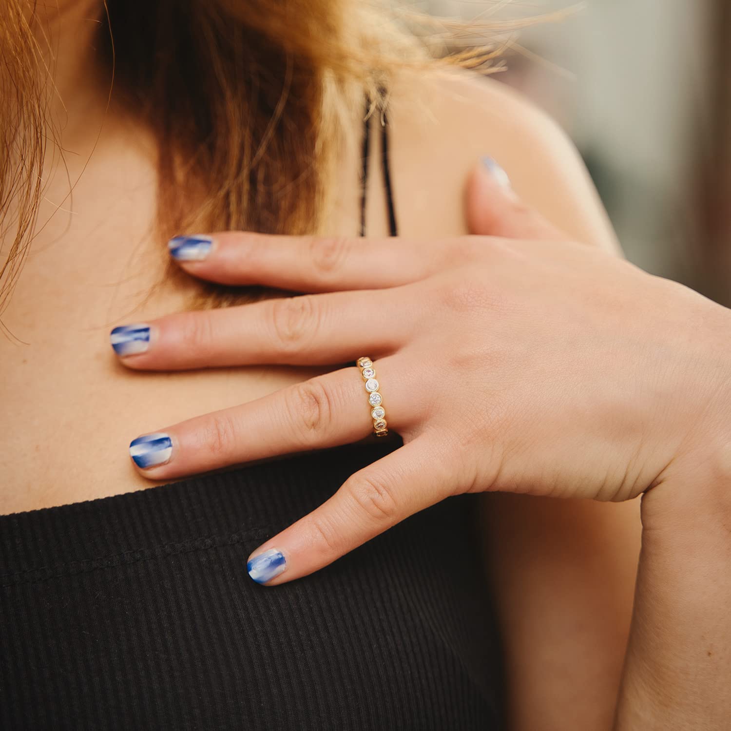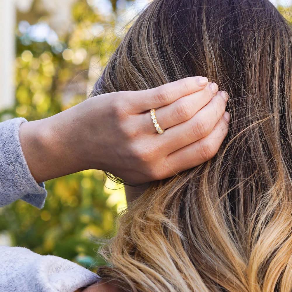 Straordinarie pietre preziose con pavé francese scorrono per tre quarti lungo la fascia e catturano l'attenzione in questo anello classico ma straordinario. Abbinato a un anello di fidanzamento o da solo, questo anello è perfetto da indossare ogni giorno.
