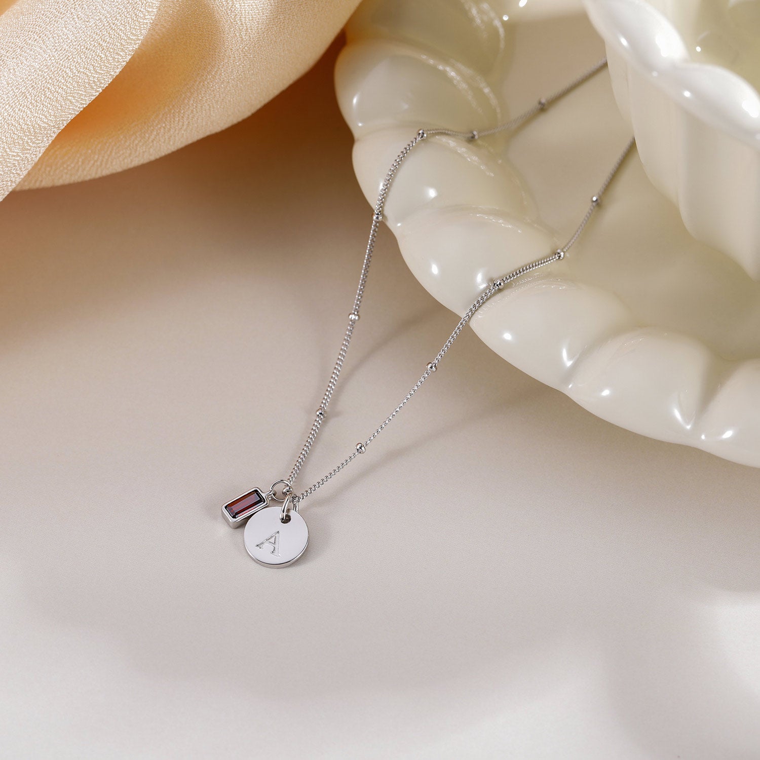A hand-stamped initial necklace with a birthstone of your choice.This charming personalized birthstone initial necklace, adorned with delicate beads, one pendant is set with 6*3mm CZ stone, and the other can be engraved with a monogram, exudes timeless elegance. Crafted to perfection, it's a symbol of affection and style. Perfect for gifting.