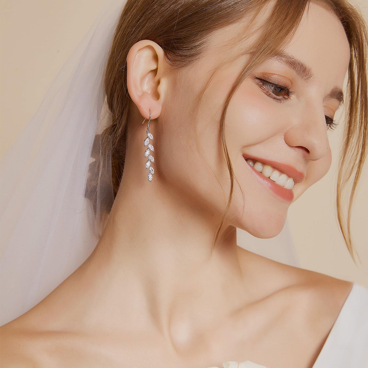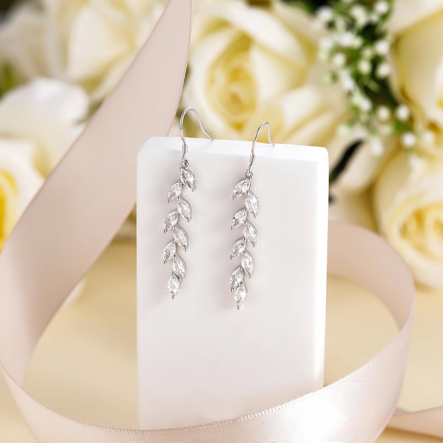 This stunning pair of earrings is made up of marquise cut cz stones crisscrossed to form the shape of a leaf, with each zirconia carefully crafted to mimic the charm of the real stone. Measuring 36.5 millimeters in length, these elegant earrings have a striking and impressive silhouette.