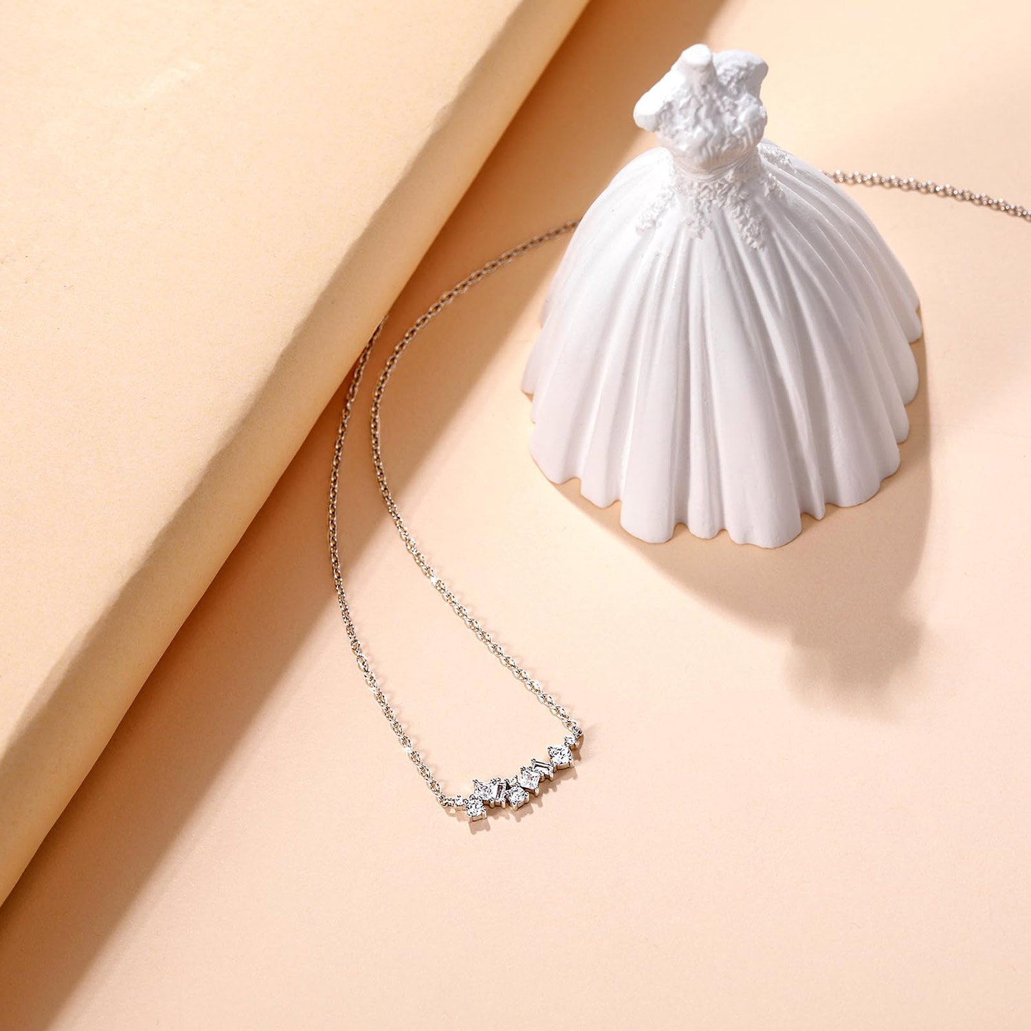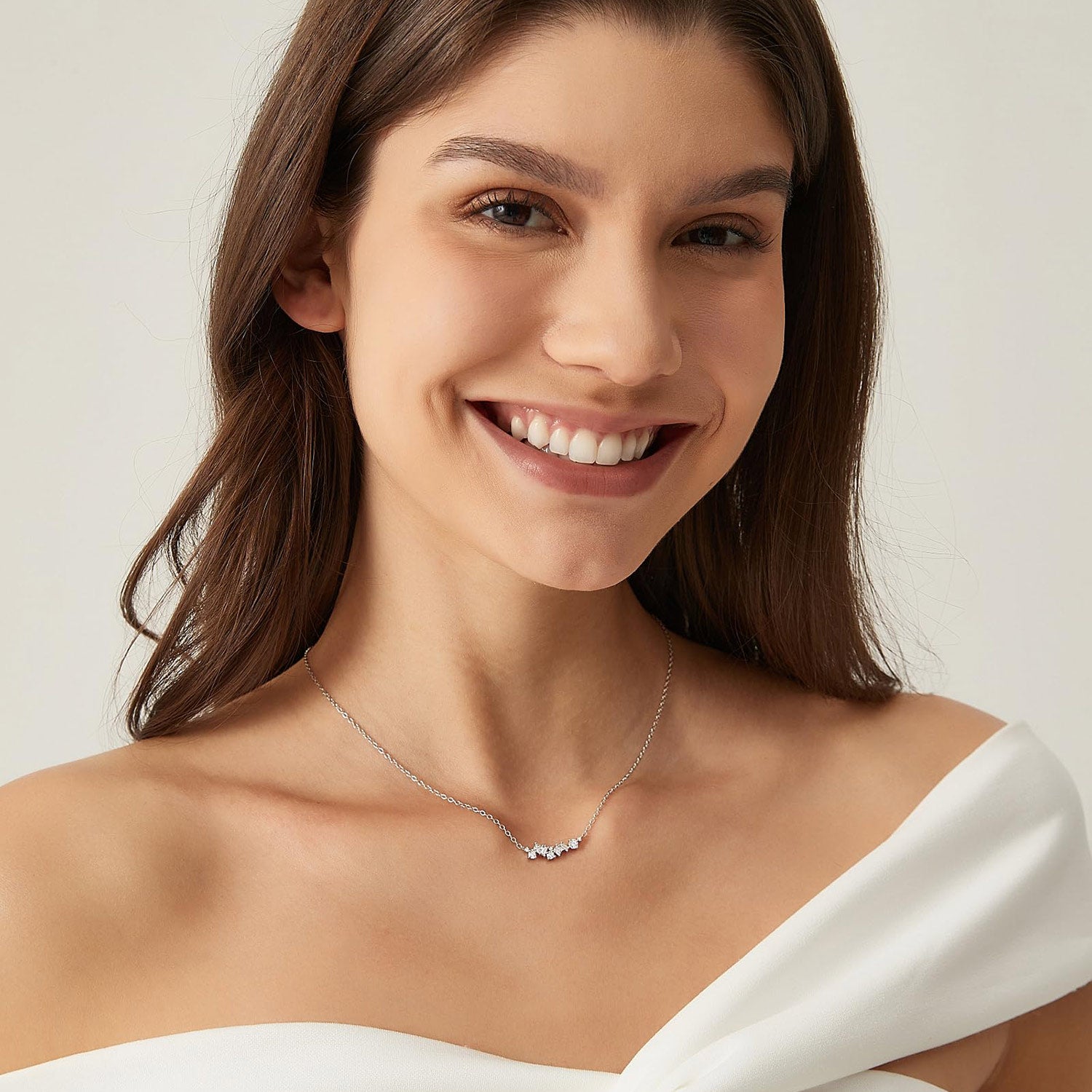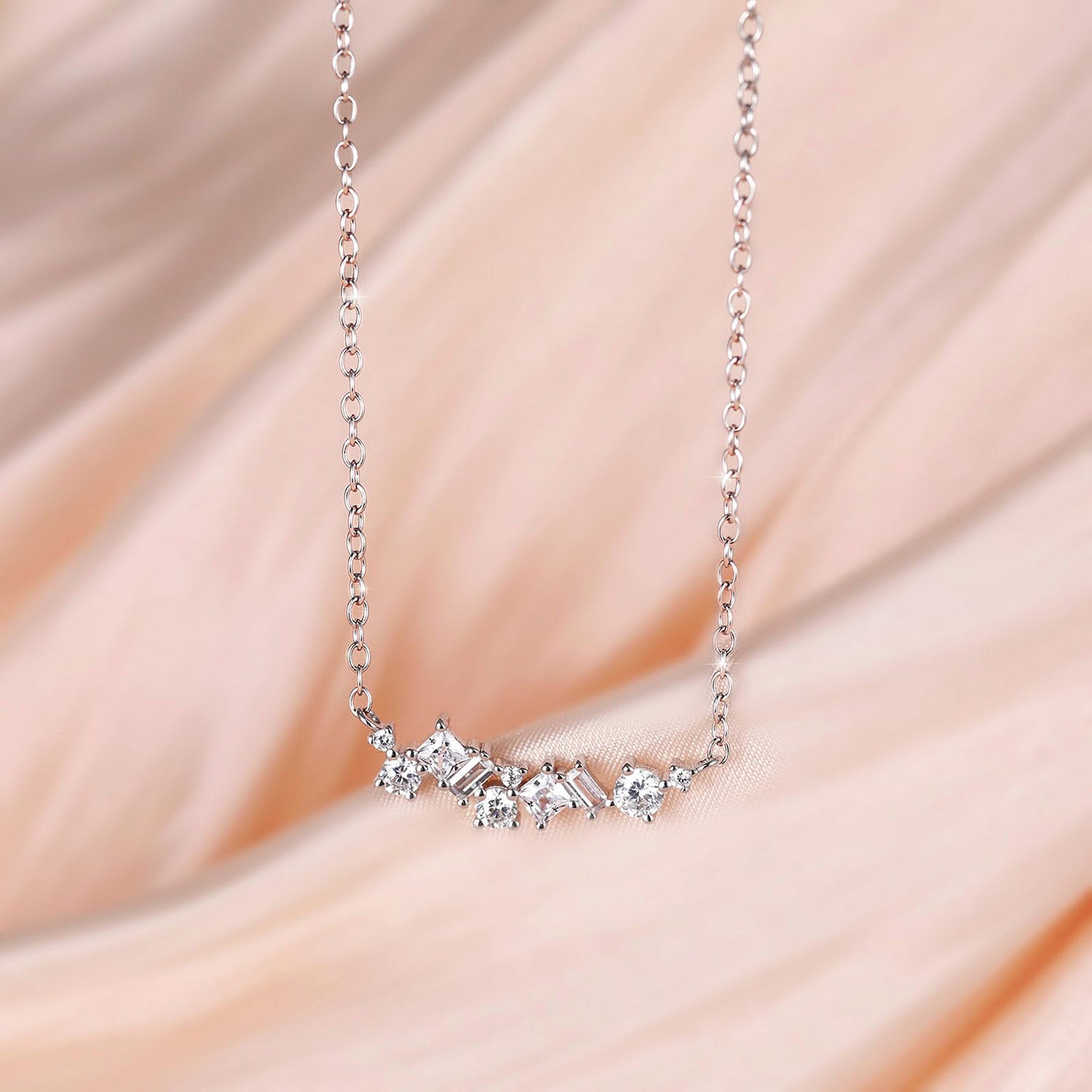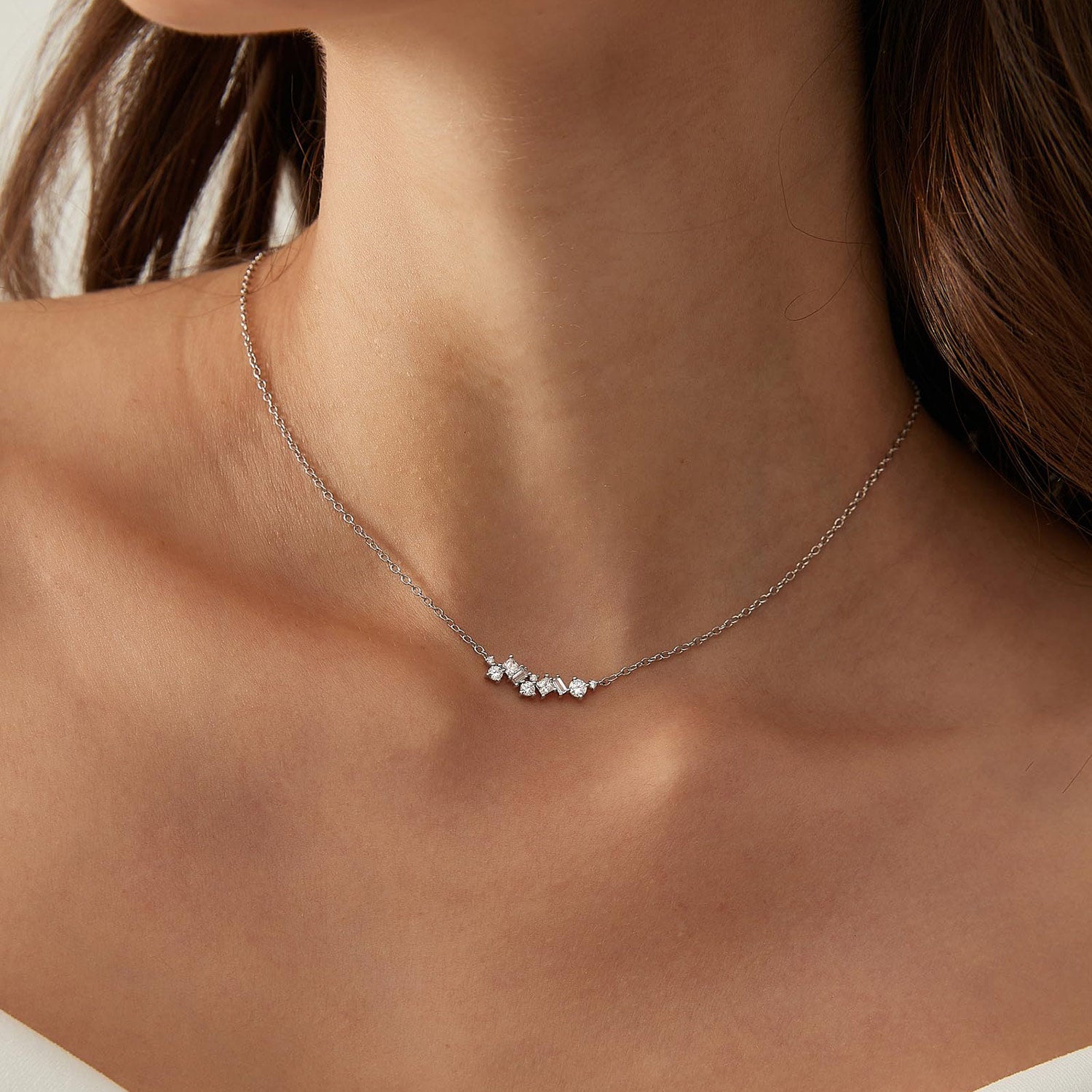This delicate 925 sterling silver necklace features a stunning cluster of round and emerald cut cubic zirconia stones, set in a 22mm wide pendant with a 6.5mm height. Perfect for bridesmaids or as a chic wedding necklace, it adds a touch of sparkle and elegance to any special occasion.