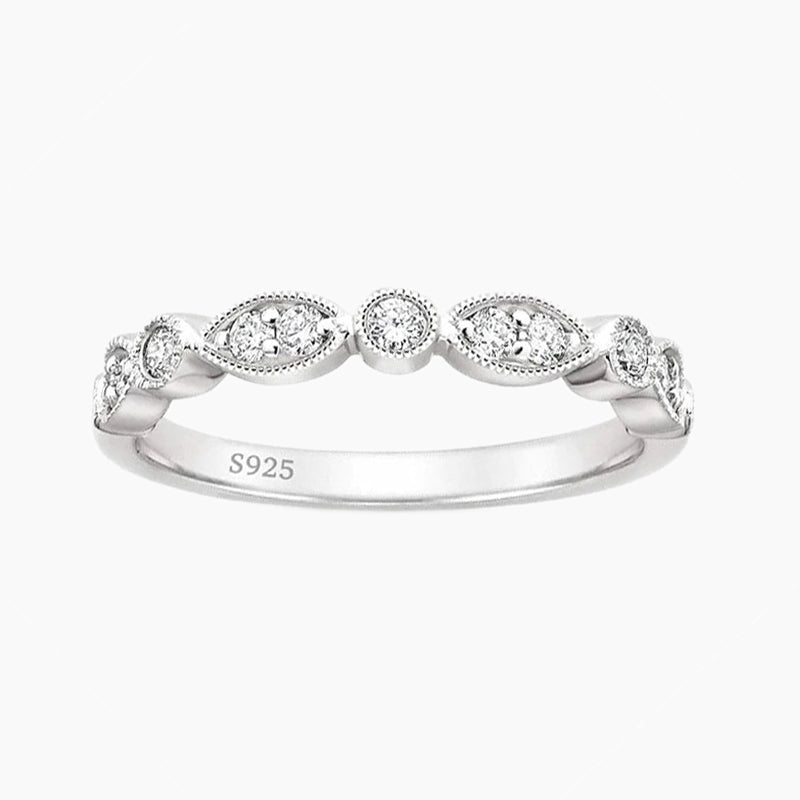 Questo delicato anello raggiunge un aspetto romantico e antico con montature rotonde e marquise alternate che comprendono un terzo del gambo. Questa elegante fede di fidanzamento in argento sterling è appariscente senza sembrare di cattivo gusto, perfetta per la donna che ama il classico look con pietre preziose.