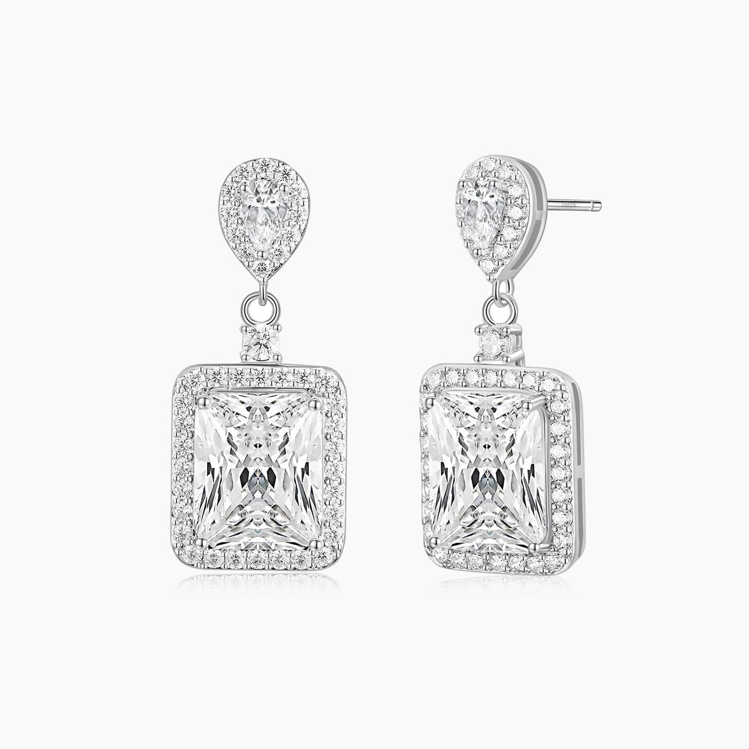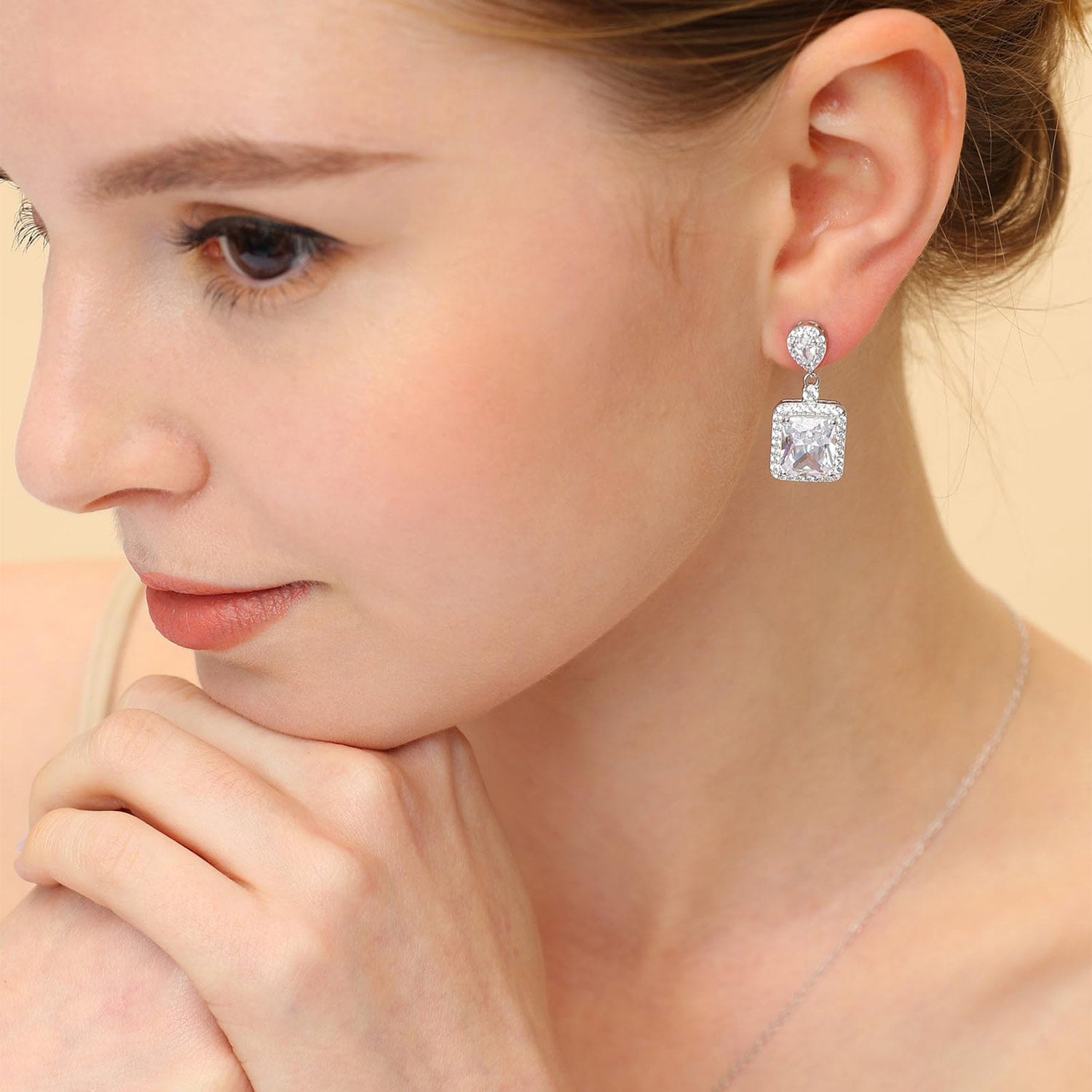 This a pair of silver dangle earrings for women that feature cubic zirconia stones cut in an emerald shape. The earrings are specifically designed for bridal and wedding events, and feature 925 sterling silver posts, which indicate that they are made of high-quality, genuine silver. This is undoubtedly a gorgeous jewelry gift for wives, daughters, granddaughters, mothers, and friends, a sentimental surprise for a lady, and a great gift to show that you are always there for her.