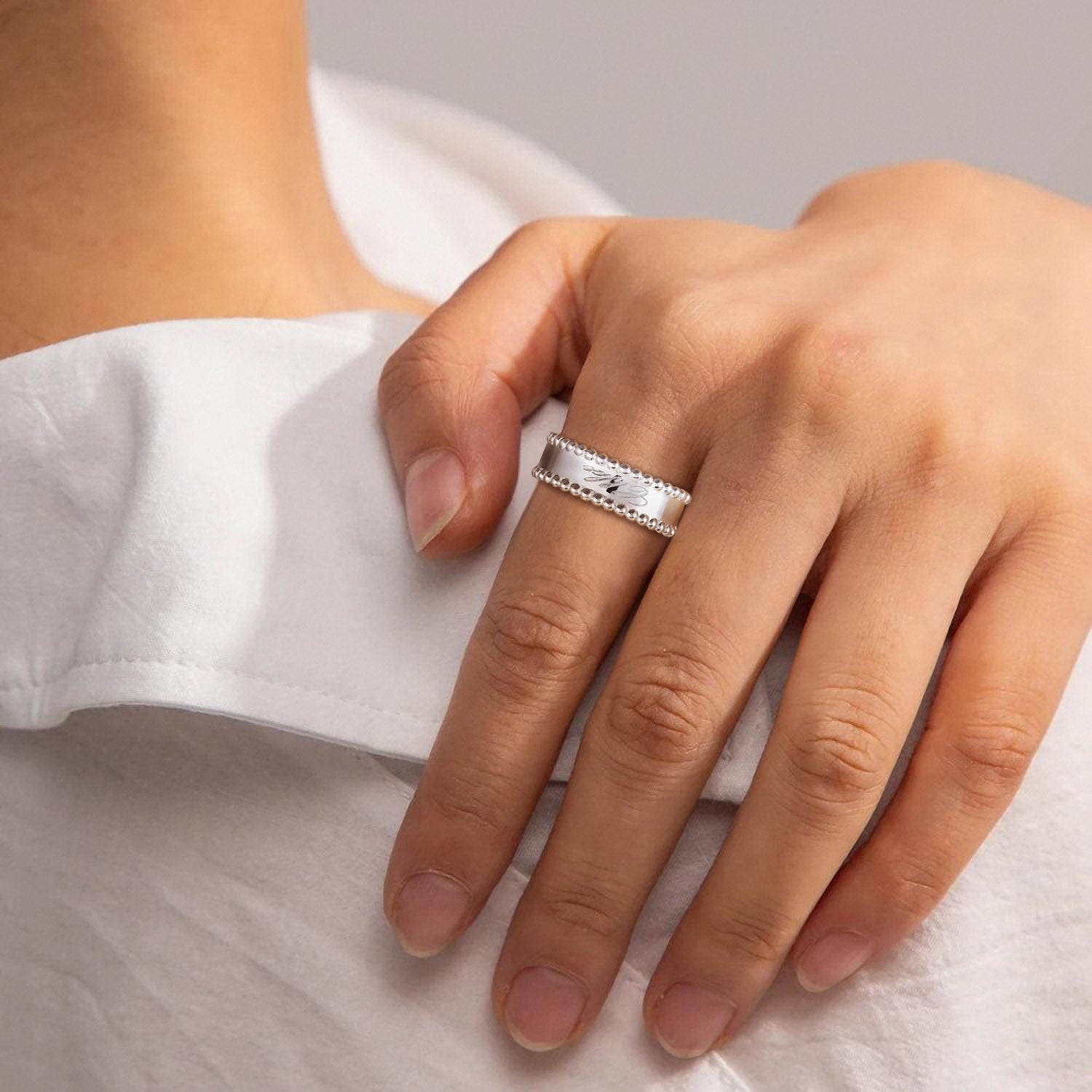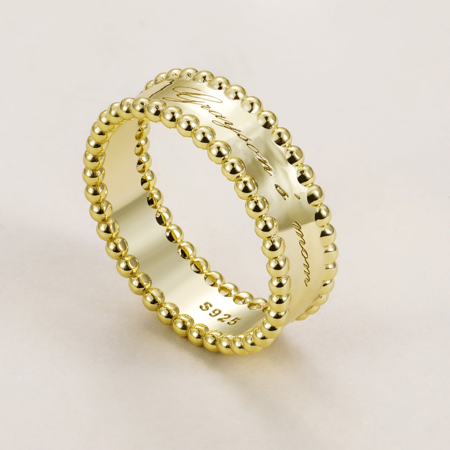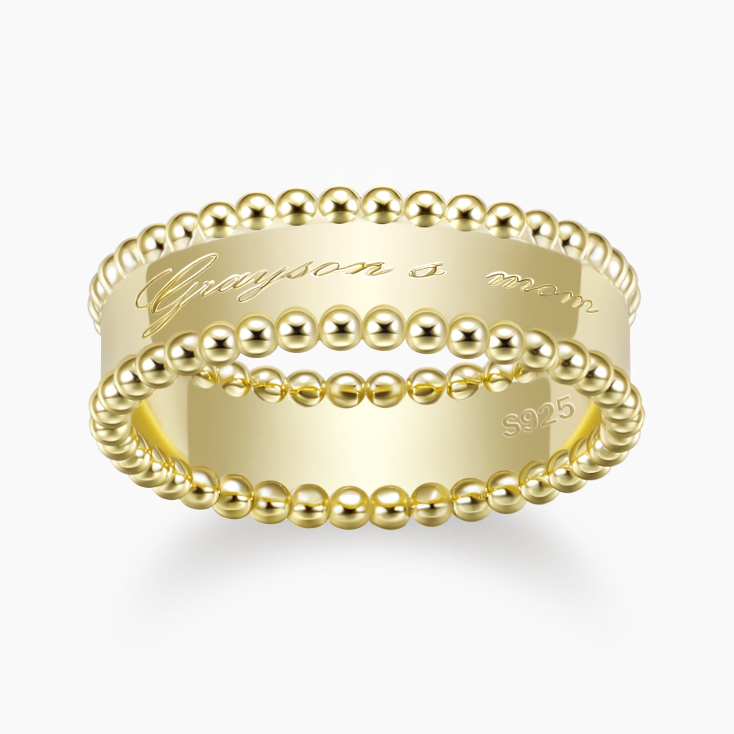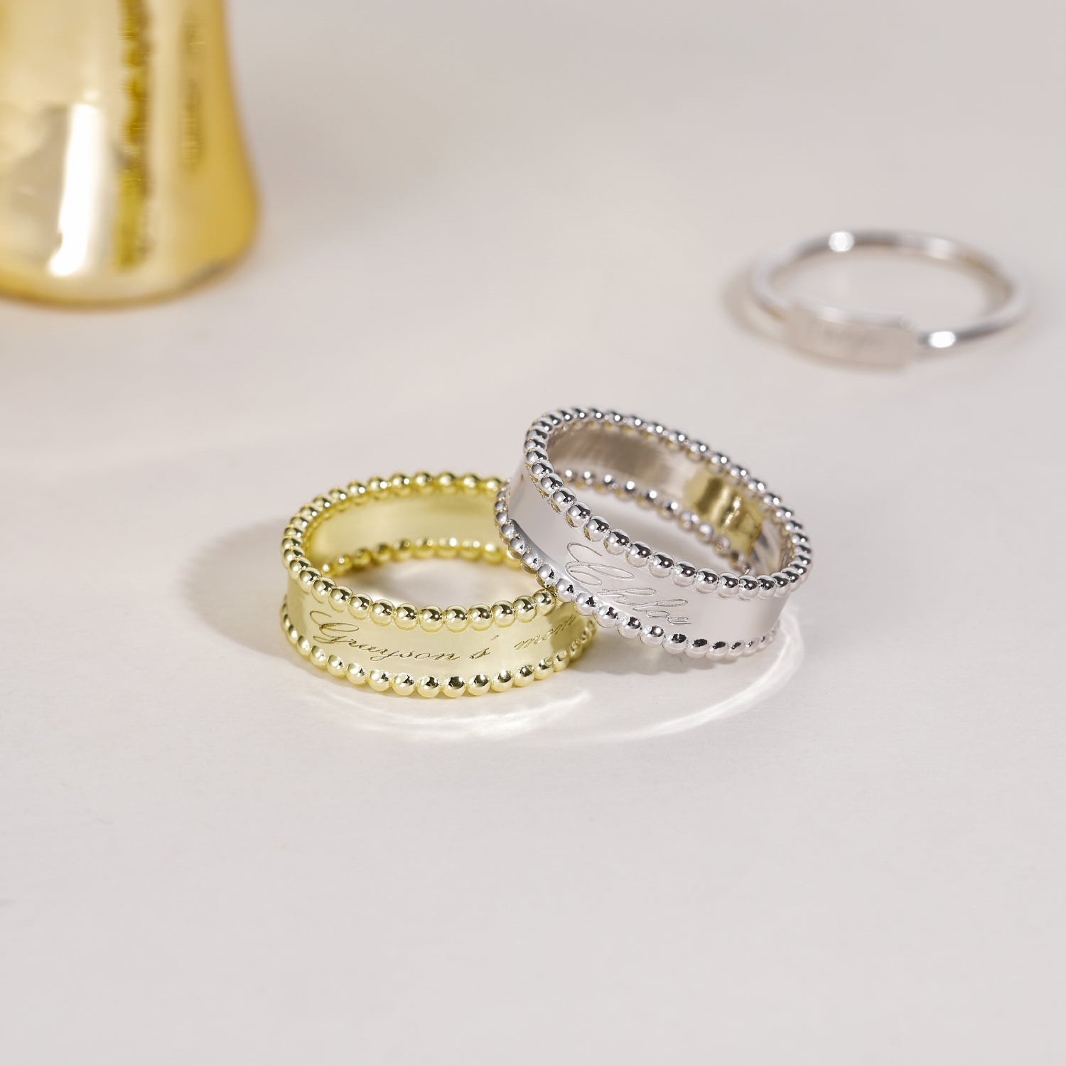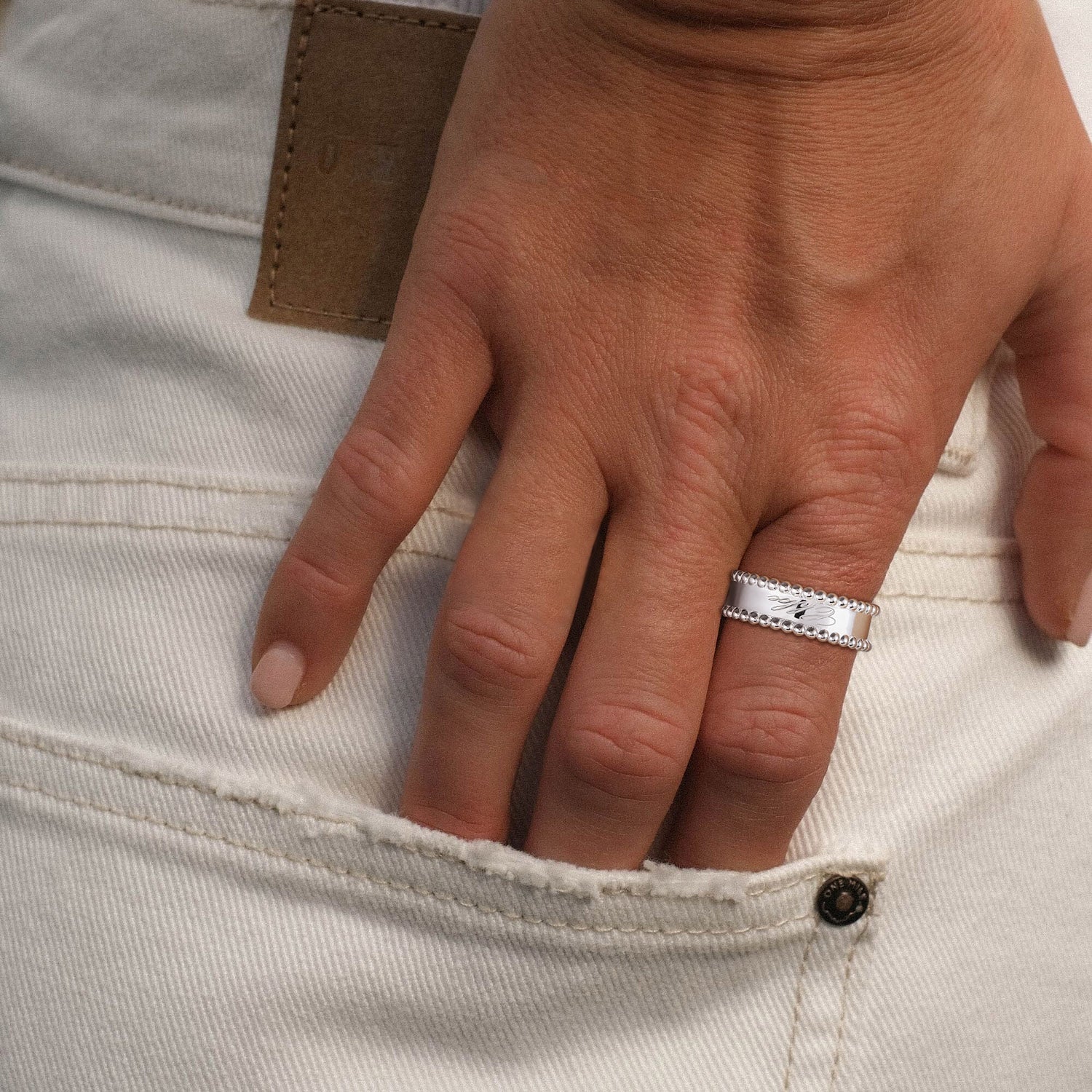 This ring features your name crafted in a stylish font, with a unqiue engraving that brings a personal touch to this timeless piece, a perfect addition to any jewelry collection. Gold and silver tons are available.