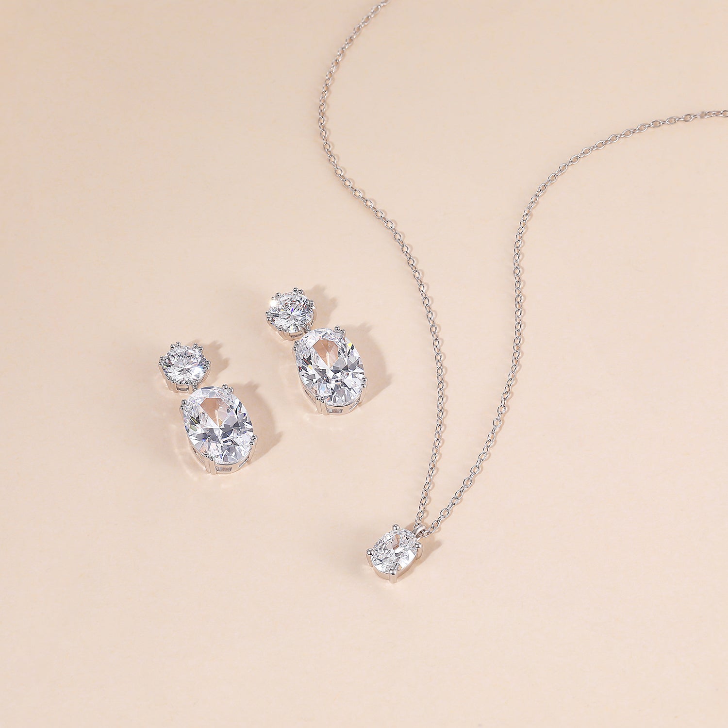 Classic oval cut CZ necklace and earrings set in sterling silver. The necklace features a single oval-cut stone, while the earrings combine round tops with oval drops. Perfect as wedding jewelry for the bride, this matching set offers timeless elegance for your special day.
