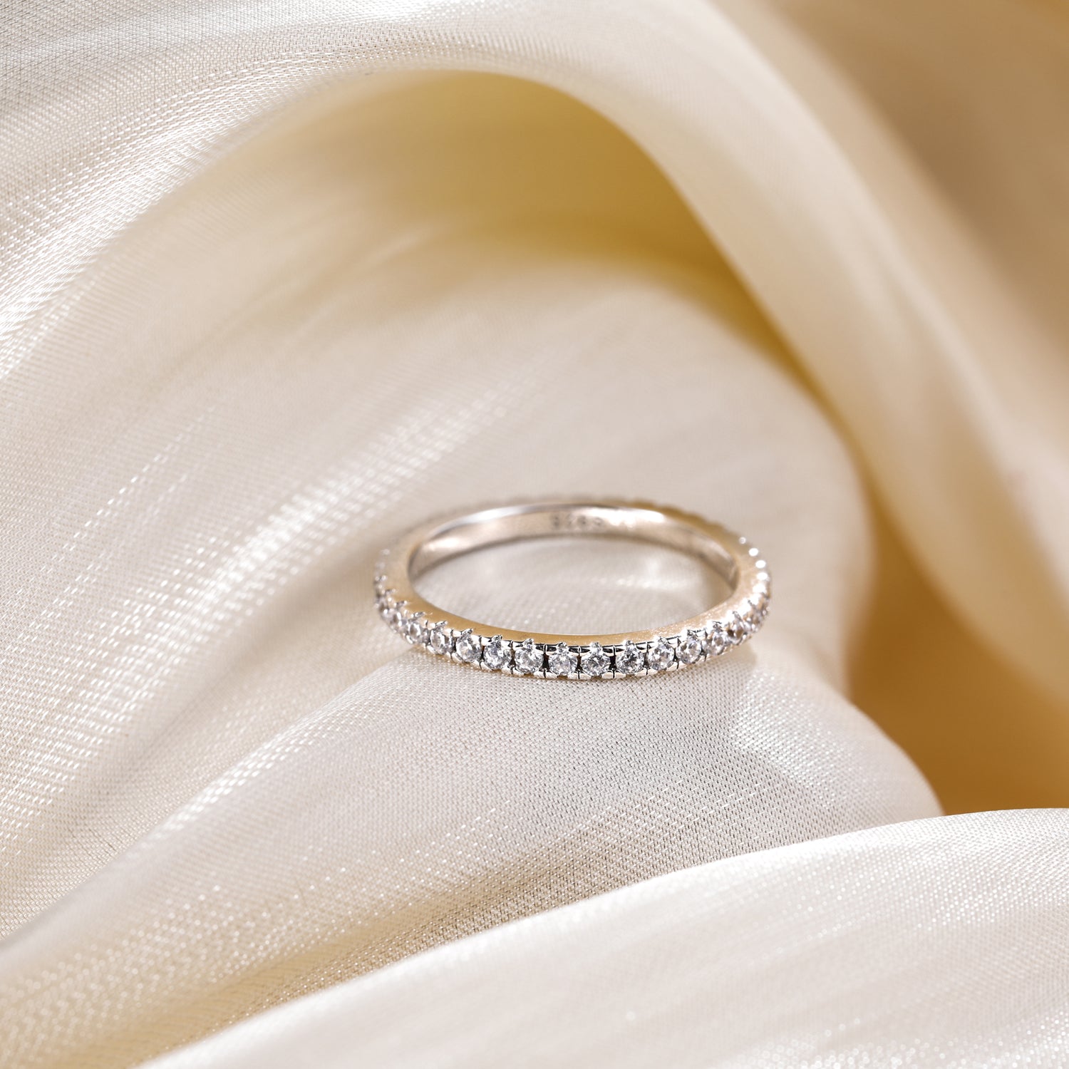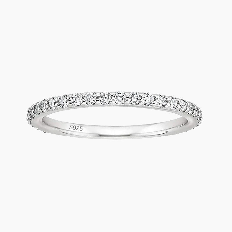 Cerchi qualcosa di abbastanza bello da indossare da solo ma facile da impilare e abbinare ad altri anelli glam della tua collezione? Questo anello eternity in argento sterling con pavé CZ si adatta perfettamente al conto. È un modo semplice per aggiungere un po' di brillantezza a qualsiasi outfit.